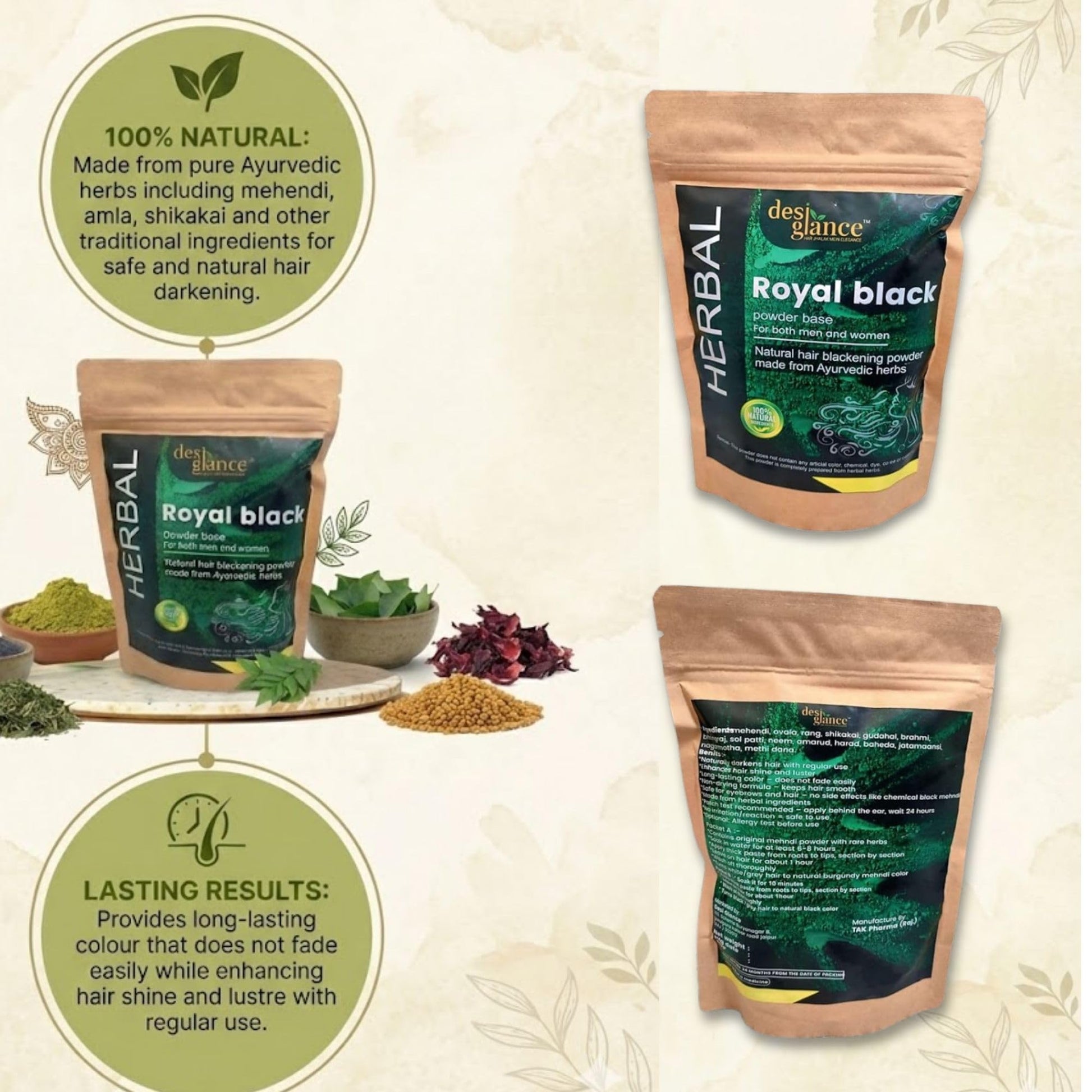 - DUAL PRODUCT COMBO: Includes herbal hair pack/shampoo and Royal Black powder for comprehensive hair treatment and natural colour enhancement
